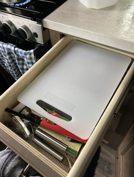 Da man in Alaska und Yukon leider nicht allen Schlaglöchern auf der Straße ausweichen kann, muss man sich nicht wundern, wenn Messer, Gabel und Löffel wie von Geisterhand verschwinden. Die Besteckschublade ist meist die oberste und hinten nicht ganz geschlossen. Als Hilfe wird das Schneidebrett auf den Besteckeinsatz gelegt.
