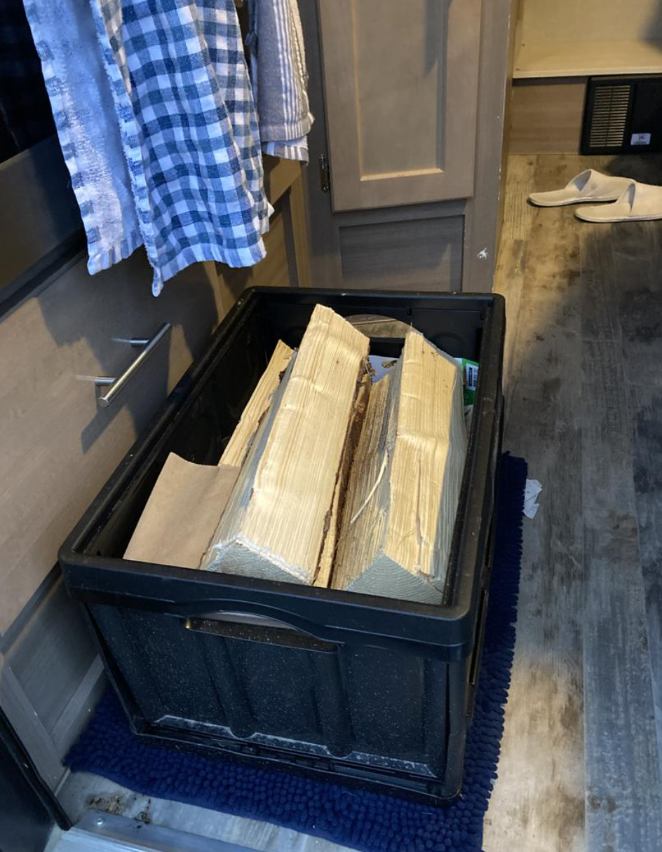 Im Aussenkasten hat es meist keinen Platz für das Holz, da schon die Stühle etc.drin sind. Darum ist eine Plastikbox ein riesiger Vorteil. Während der Fahrt ist die Kiste im Camper und auf dem Standplatz ist die Kiste unter dem Fahrzeug ,so das sie nicht Nass wird.