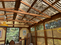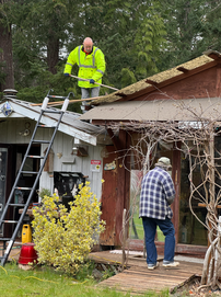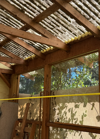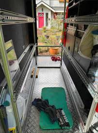 Bis Bert da war, habe ich damit begonnen, das Fahrzeug fertigzumachen. Dann kam Bert und wir begannen mit dem letzten Projekt. Heute war das Häuschen dran, das Irene gerne im Winter als Pflanzendepot nutzen möchte. Für die linke und rechte Seite hatte der Schaum gereicht, den wir am Samstag im Hardware Store gekauft hatten, aber nicht für die beiden Giebel.
