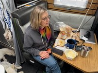 Doris machte uns einen Kaffee und danach machte sie mit ihren Armbändern weiter. Ich machte die Buchhaltung fertig und dann gab es eine wärmende Suppe zum Nachtessen.