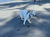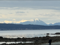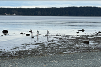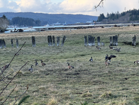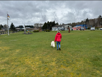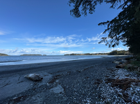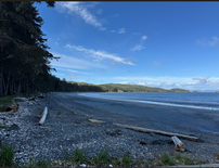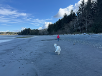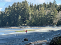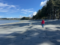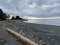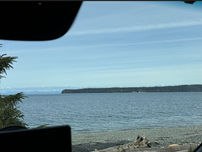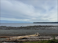 Danach suchten wir den Strand, aber ich lag falsch, er lag nicht beim Flughafen Port McNeill. Nach einiger Zeit kam Doris auf die Idee, dass er vielleicht beim Flughafen Port Hardy läge. Da wir sowieso zurückfahren mussten, versuchten wir es in Port Hardy. Und dort fanden wir den Strand. Queeny liebt den Strand und flippte richtig aus. Es war sonnig, aber es wehte eine kalte Brise.