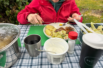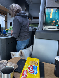 Wir sassen noch etwas draussen und genossen die Sonne. Ich flog noch kurz mit der Drohne. Als es kühler wurde, gingen wir in den Wagen und Doris machte das nachtessen.