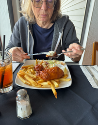 Holberg ist zum größten Teil im Besitz eines großen Holzlieferanten. Als wir wieder retour in Port Hardy waren, gingen wir noch in einen Hobby-Shop, da Doris noch einiges für ihre „Bändeli” brauchte. Danach gingen wir in ein Café etwas trinken. Es war schon 17 Uhr und wir hatten Hunger, also gingen wir in Port Hardy etwas essen. Wir nahmen beide Fisch & Chips. Der Fisch und die Pommes waren sehr gut und nicht fettig. Auf dem Heimweg holten wir uns im „Save on Food” noch etwas Salat und Gemüse. Danach fuhren wir zum Campingplatz und duschten etwas später. Den Abend beschlossen wir mit einem Krimi.