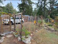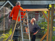 Nach dem Spaziergang kam Doris zurück und wir frühstückten. Heute war Arbeitstag: Doris half Irene im Garten, während Bert und ich einen defekten Hauptbalken des Tores ersetzten.