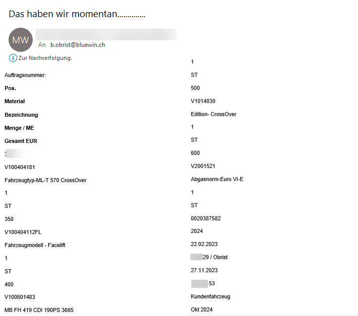 Seltsamerweise habe ich eine neue Fahrzeugliste erhalten und VL** sagte mir am Telefon, dass ich bald eine endgültige Auftragsbestätigung erhalten würde.