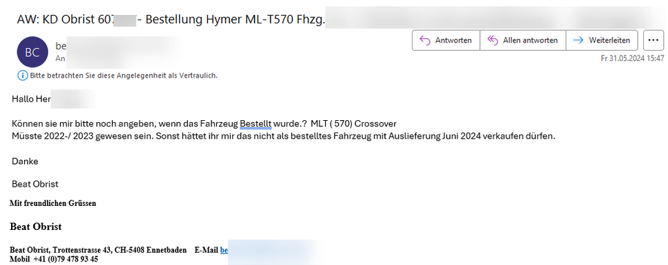 Nach erhalten seiner Kontakt Daten, fiel mir ein, das mein Fahrzeug ja ein bestelltes Fahrzeug war und es müsste irgendwie auch im 2022/2023 bestellt worden sein.