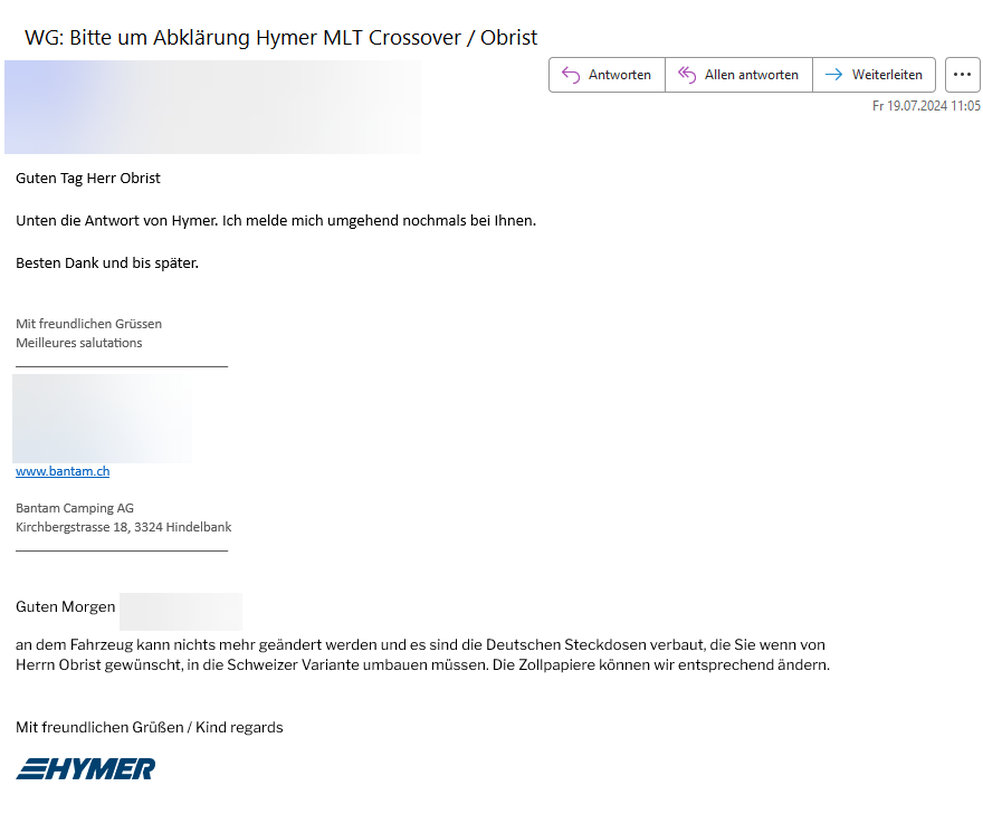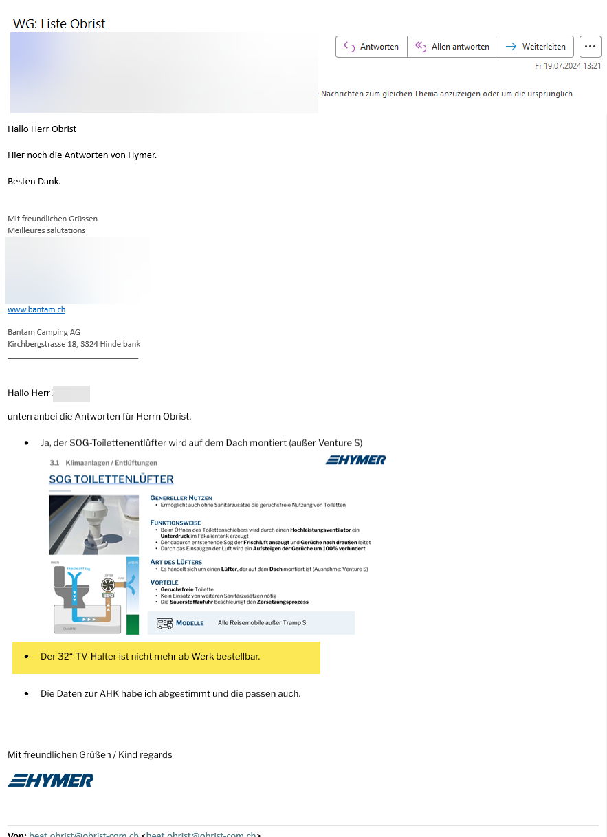 Auch eine Antwort betreffs der Fernseh Halterung kam. Die mich natürlich neue Fragen aufwarf!!!!