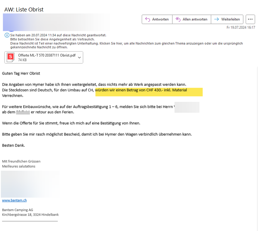 In der Zwischenzeit erhielt ich noch die Antwort betreffend den Lüfter und der Anhängerkupplung mit Gewichts erhöhung der Garage.