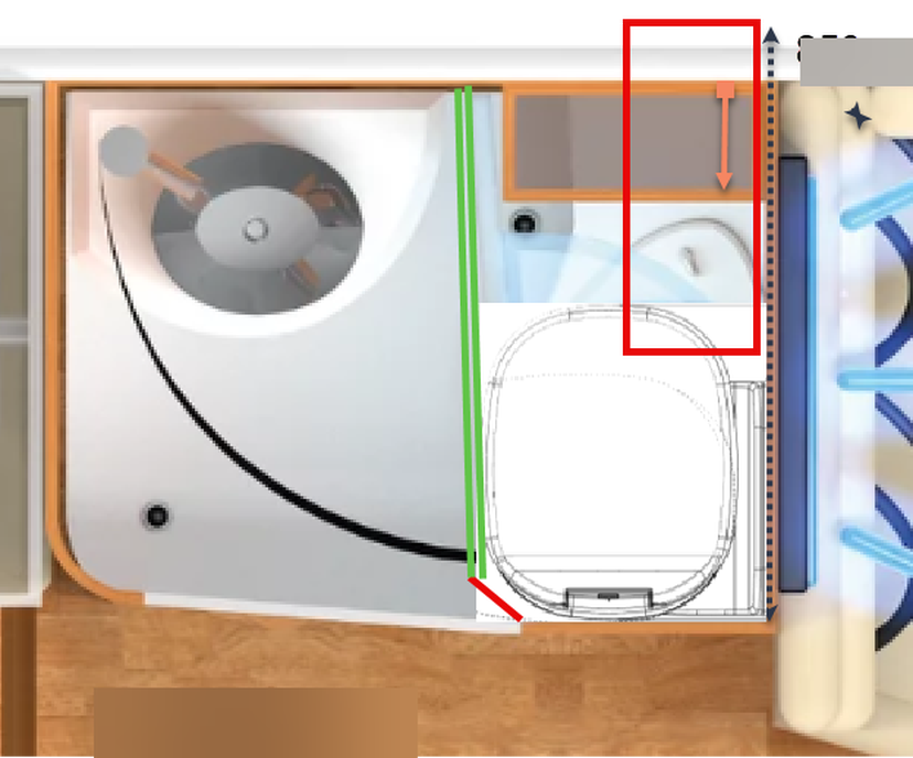 2. Clesana WC kommt vermutlich 40mm weiter nach vorne. es wäre auch am äusseren Rand (Siehe Bild) verbaut . Ich weiss nicht wie gross die Toleranz des zweiten Türlappens der Schwenktüre der Dusche ist.