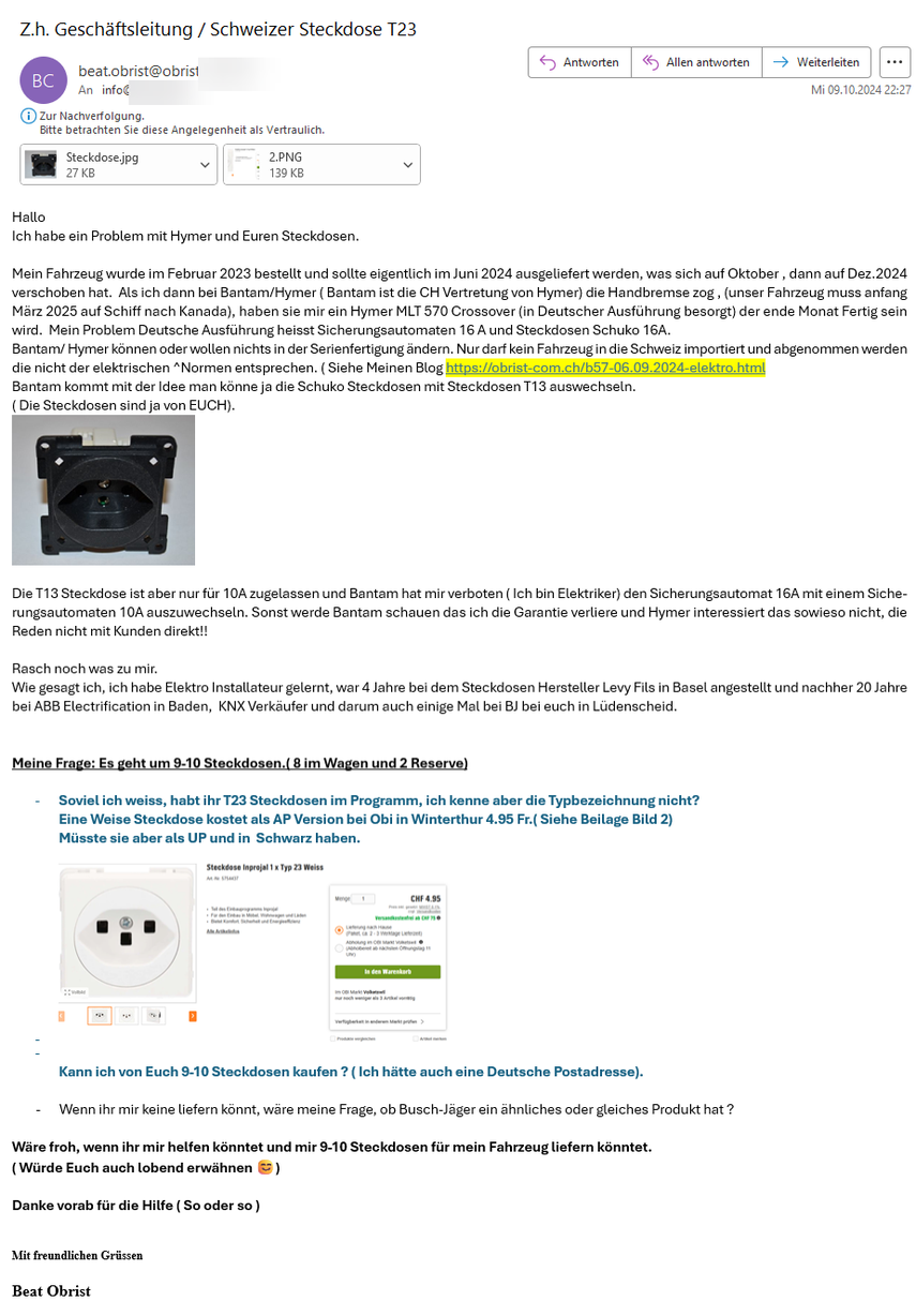 Da von Bantam nichts mehr zu hören war, habe ich mich entschlossen, mich direkt an die Firma Inprojal Elektrosysteme GmbH in Lüdenscheid zu wenden, um das Problem mit den Steckdosen zu lösen. Vielleicht können wir das Problem mit einer 16A CH-Steckdose (T23) lösen.