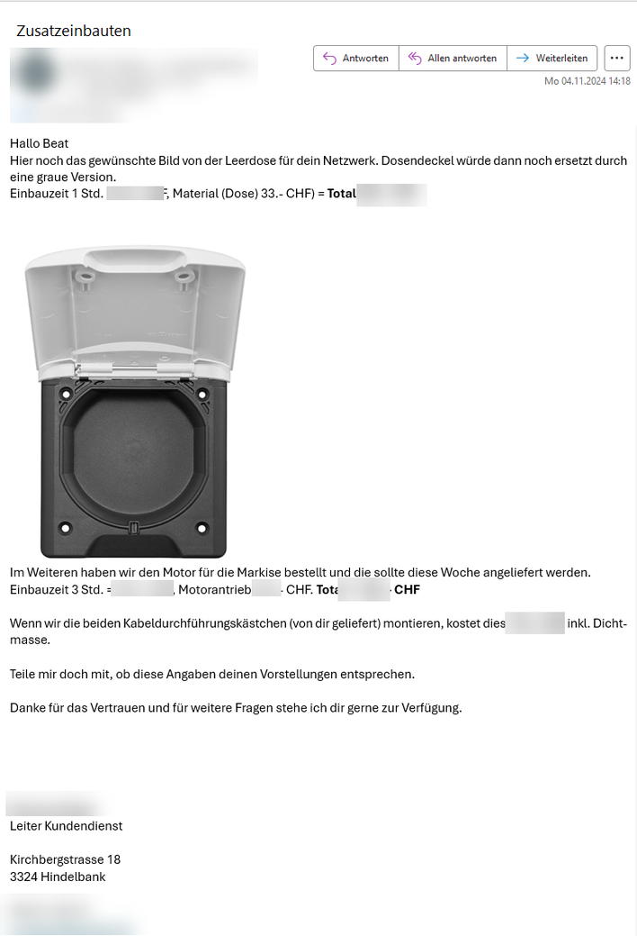 Heute erhielt ich vom Leiter Kundendienst NX die versprochene Offerte für meine 3 Zusätze.
