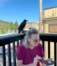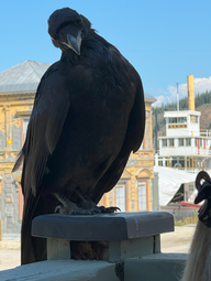 Danach gingen wir noch etwas durch die Stadt und setzten uns im Café auf die Terrasse, um etwas zu trinken. Ein Rabe hatte Freude an Doris und saß die ganze Zeit in ihrer Nähe auf dem Pfosten.