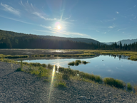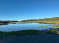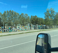 Nach 260 km erreichten wir unseren ersten Stop :Watson Lake. Dort besuchten wir das Schild, tankten noch einmal und kauften etwas Brot ein. Dann ging es weiter Richtung Liard. Nach etwa 50 km verließen wir den Yukon und wechselten nach British Columbia (BC). Garmin zeigte uns zwei Liard Provincial Parks mit heißen Quellen an. Der erste sah aus wie ein Motel und hatte eine Wiese als RV-Campground. Alles sah nicht sehr einladend aus. Darum fuhren wir mit voller Überzeugung weiter, da wir davon ausgingen, dass das andere der richtige Liard sei (er lag am Ende des Lake Muncho). Nach 30 km waren wir am Ende des Sees. Dort, wo laut Garmin die heißen Quellen und der Park sein sollten, war jedoch nur heiße Luft!