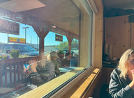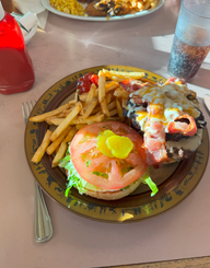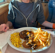 Um 18:30 Uhr gingen wir essen, als Doris mit dem Waschen fertig war. Für mich gab es einen Burger und für Doris Yukon-Schnitzel.