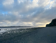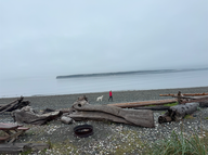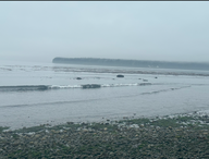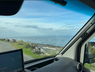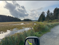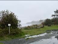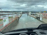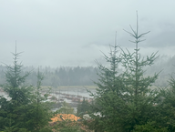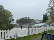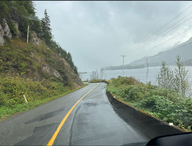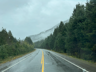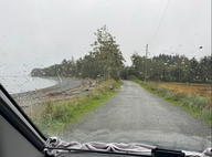 Um 07:30 Uhr war der Nebel ziemlich dicht und das Nebelhorn hupte dauernd. Das Nieseln hatte sich gelegt, aber es gab große Wasserpfützen um das Auto herum.