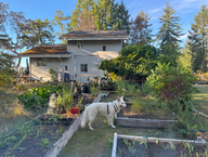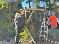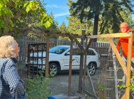 Nach dem Spaziergang kam Doris zurück und wir frühstückten. Heute war Arbeitstag: Doris half Irene im Garten, während Bert und ich einen defekten Hauptbalken des Tores ersetzten.