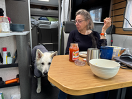 Als wir zum Campground zurückkamen, wechselte ich die Batterie des Reifendruck-Sensors am rechten Hinterreifen und sah zufällig das Problem. Es war eine Schraube, die im Reifen steckte. Ich werde morgen nach dem Dichtigkeits-Test den Reifen reparieren lassen müssen. Während dessen verpackte Doris das Hundefutter in 24o gr. Portionen.
