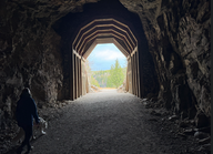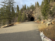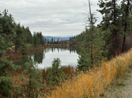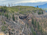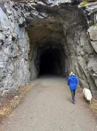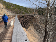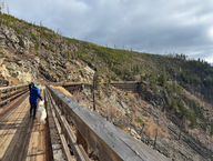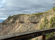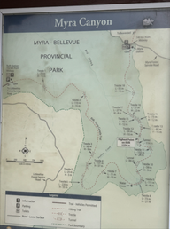 Doris war am Morgen wieder im Hundepark und kam um 10:15 Uhr zurück. Zuerst frühstücken wir, dann gingen wir zum Campground Office. Wir können bis Donnerstagmorgen bleiben. Donna gab uns einen Ausflugstipp. Sie sagte, wir sollen den Myra Canyon besuchen. Auf den alten Gleisen wurden ein Fahrrad- und Spazierweg gebaut.
