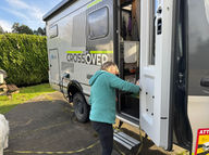 Wir waren etwa zwei Stunden unterwegs und fuhren dann zurück zum Campingplatz. Ich habe den Wagen verkehrt geparkt. So konnte ich den Grauwassertank mit dem Schlauch reinigen und das Wasser direkt über den Abwasser-Schlauch entsorgen. Nachdem der Tank sauber und geputzt war, musste alles wieder eingeräumt werden.